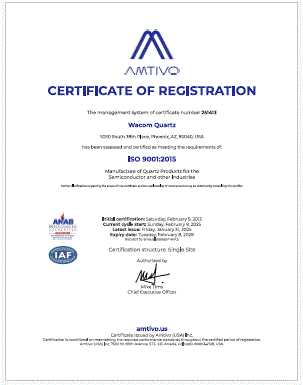 We first applied for and were granted ISO registration in January 2001 (ISO 9002:94); later upgraded that certificate to ISO 9001:2000, and most recently our current ISO 9001:2015. The quality system is monitored by our third party registrar "Amtivo" as well as by regular internal audits and also audits/inspections by our customers upon request.