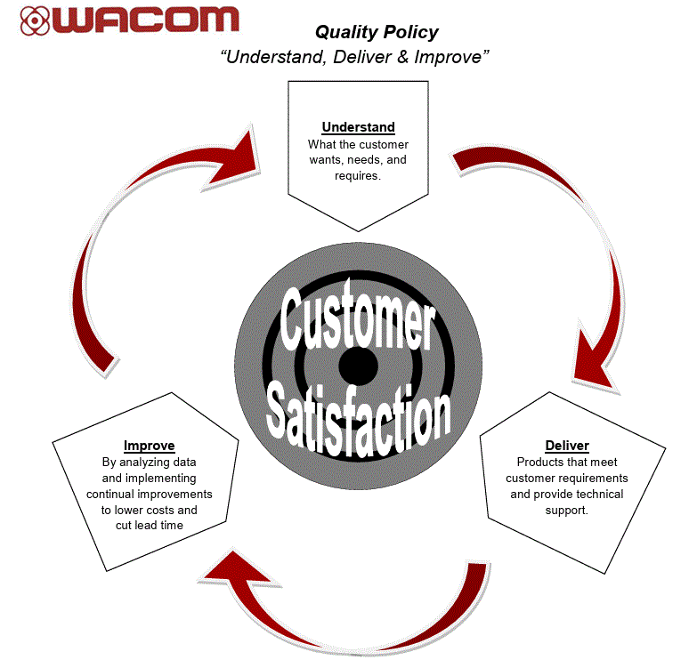 Wacom Quartz will develop and improve long lasting partnerships with customers, employees and suppliers that will ensure both customer satisfaction; and a strong, profitable business for a healthy future. The management of Wacom Quartz is committed to continually supporting our stated quality objectives. Thru planning, review, and taking actions to meet those objectives, we support our quality system at all levels of the company.